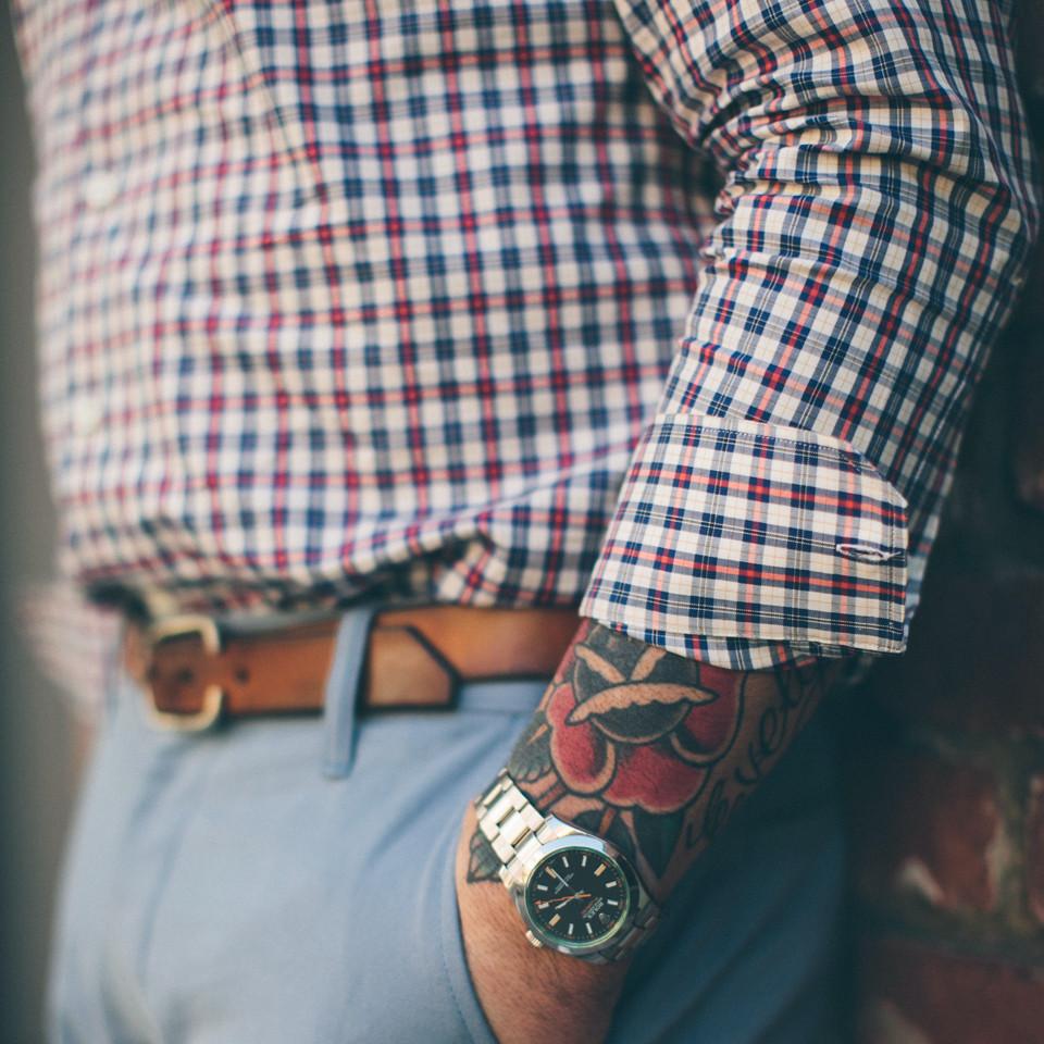 - Single button angled cuff.