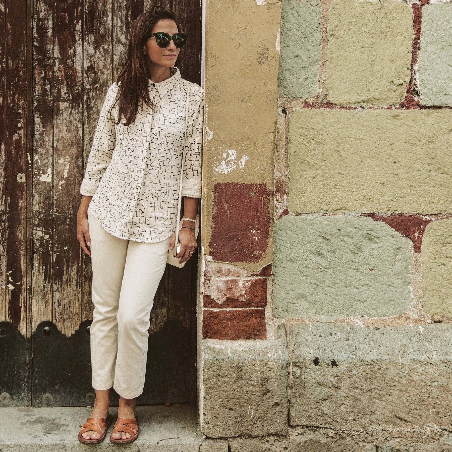 Print pops brilliantly on the Michelle. With a covered front placket concealing the buttons and single-needle construction, this silhouette is the perfect canvas for a fun, patterned fabric.